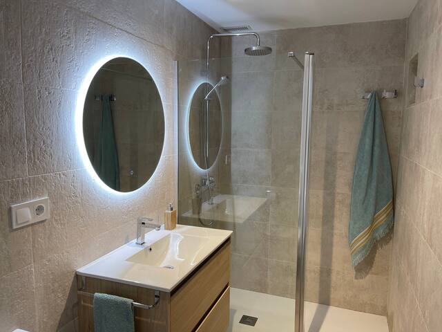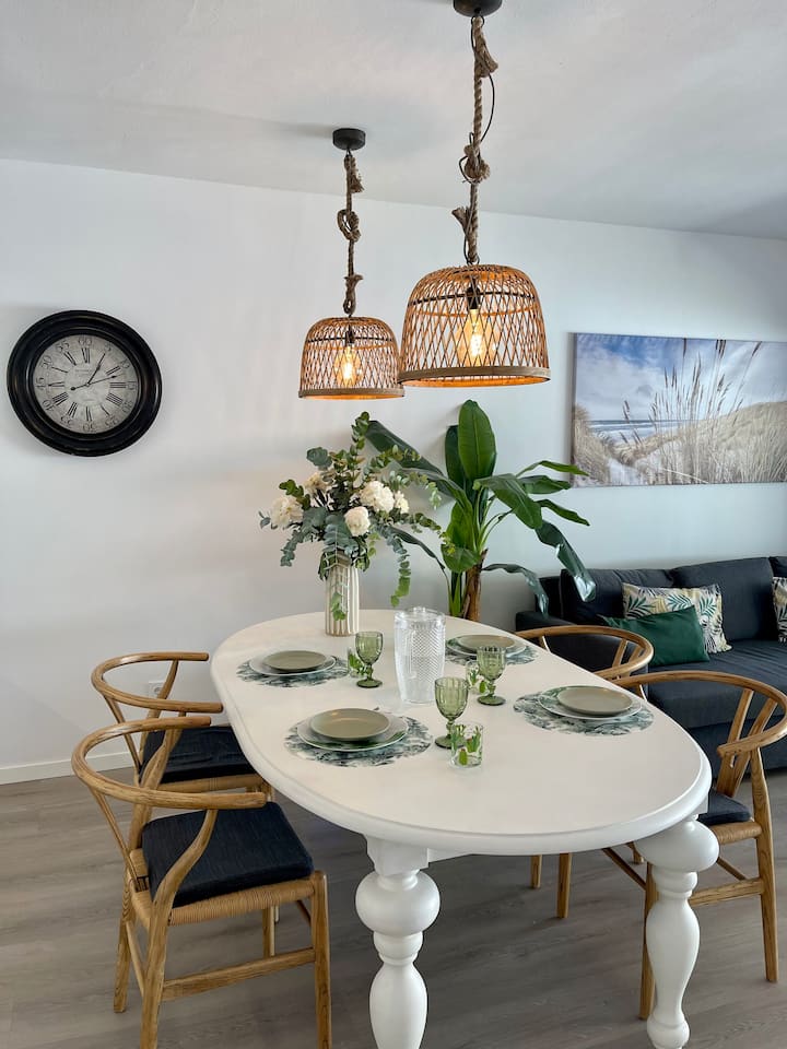 El apartamento dispone de dos grandes correderas que dan su terraza privada de 40mts cuadrados, que le proporcionan una magnifica luz. Es un amplio apto decorado en tonos naturales, ubicado en una urbanización cuya vegetación es impresionante, la zona piscina es muy agradable, cuesta que nuestros huéspedes salgan de ella y se dirijan al mar que esta a unos escasos 150 metros. Rodeado de todo tipo de servicios, hoteles, chiringuitos y restaurantes.